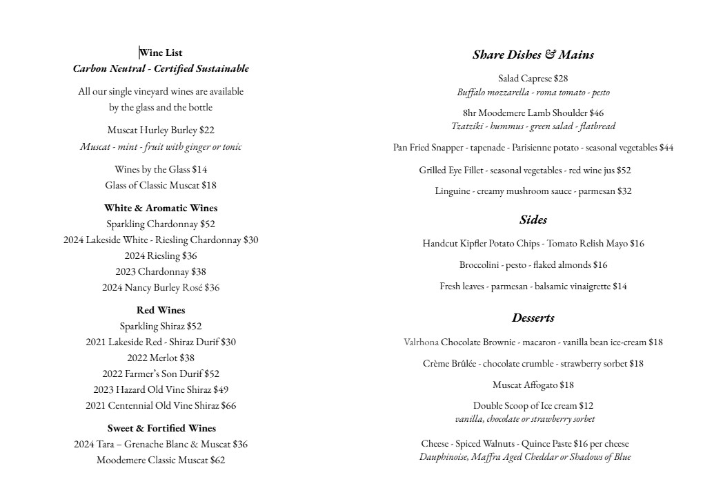 Casual & Fine Dining: Showcases local produce & suppliers from Rutherglen and surrounds. The seasonal menu focuses on the best locally sourced produce and suppliers and includes a variety of gluten free, dairy free, vegetarian and vegan options. The vineyard that sits on the Cofield Wines site, is called the "Quartz Vein Vineyard", hence the inspiration behind the name.